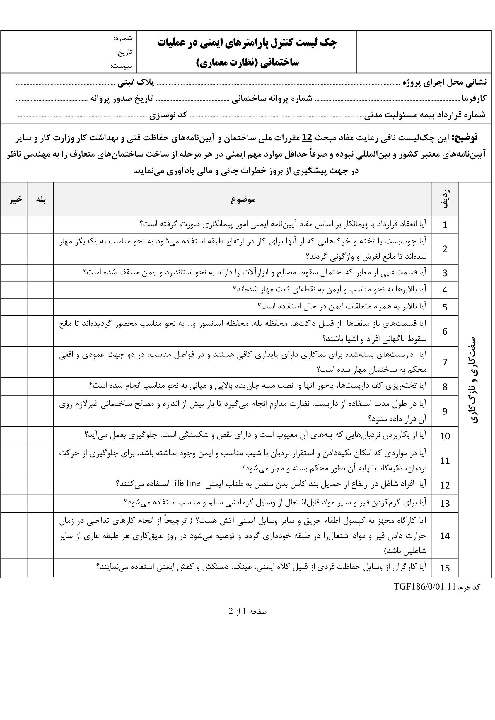 چک لیست کنترل پارامتر های ایمنی عملیات ساختمانی نظارت سازه