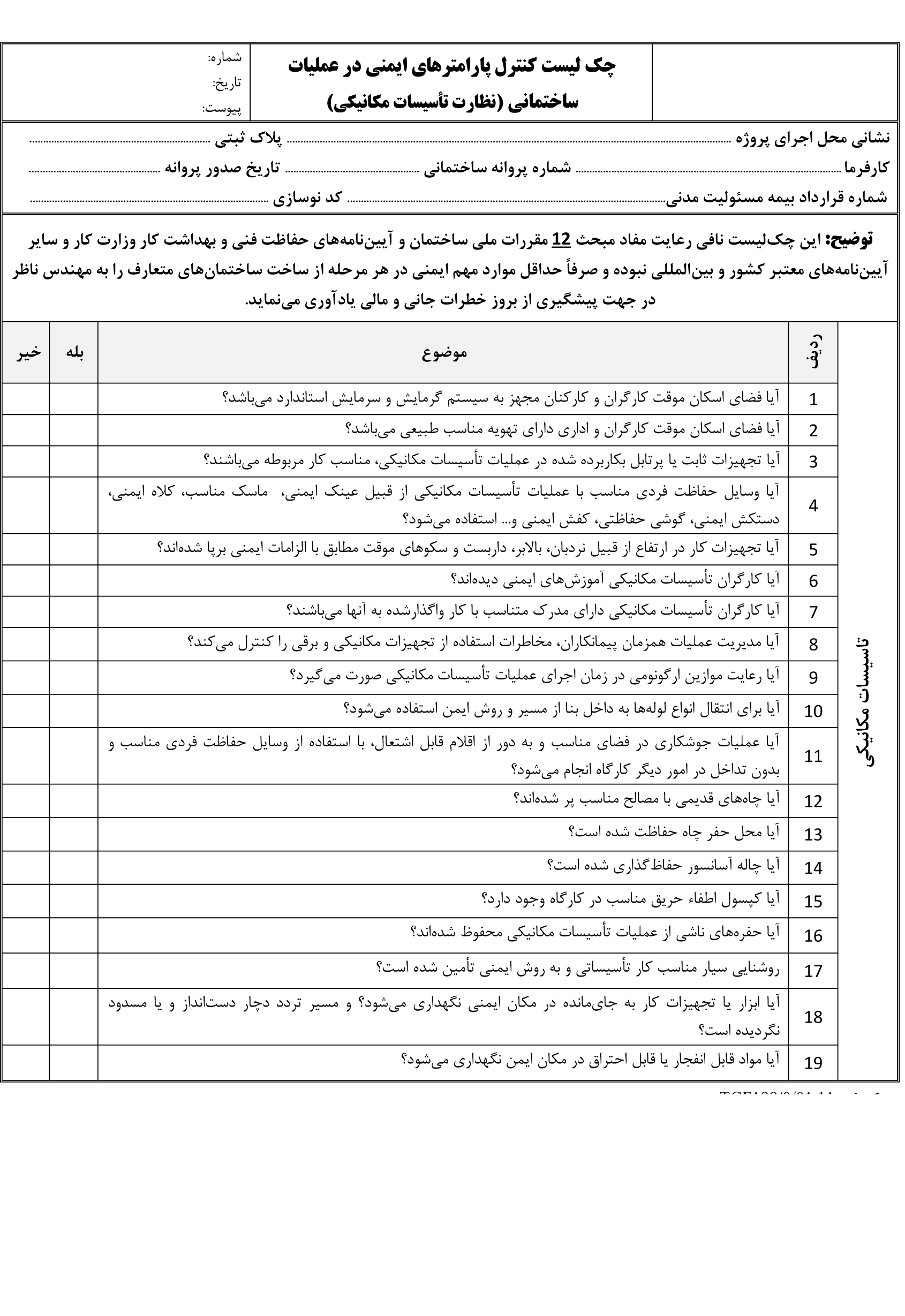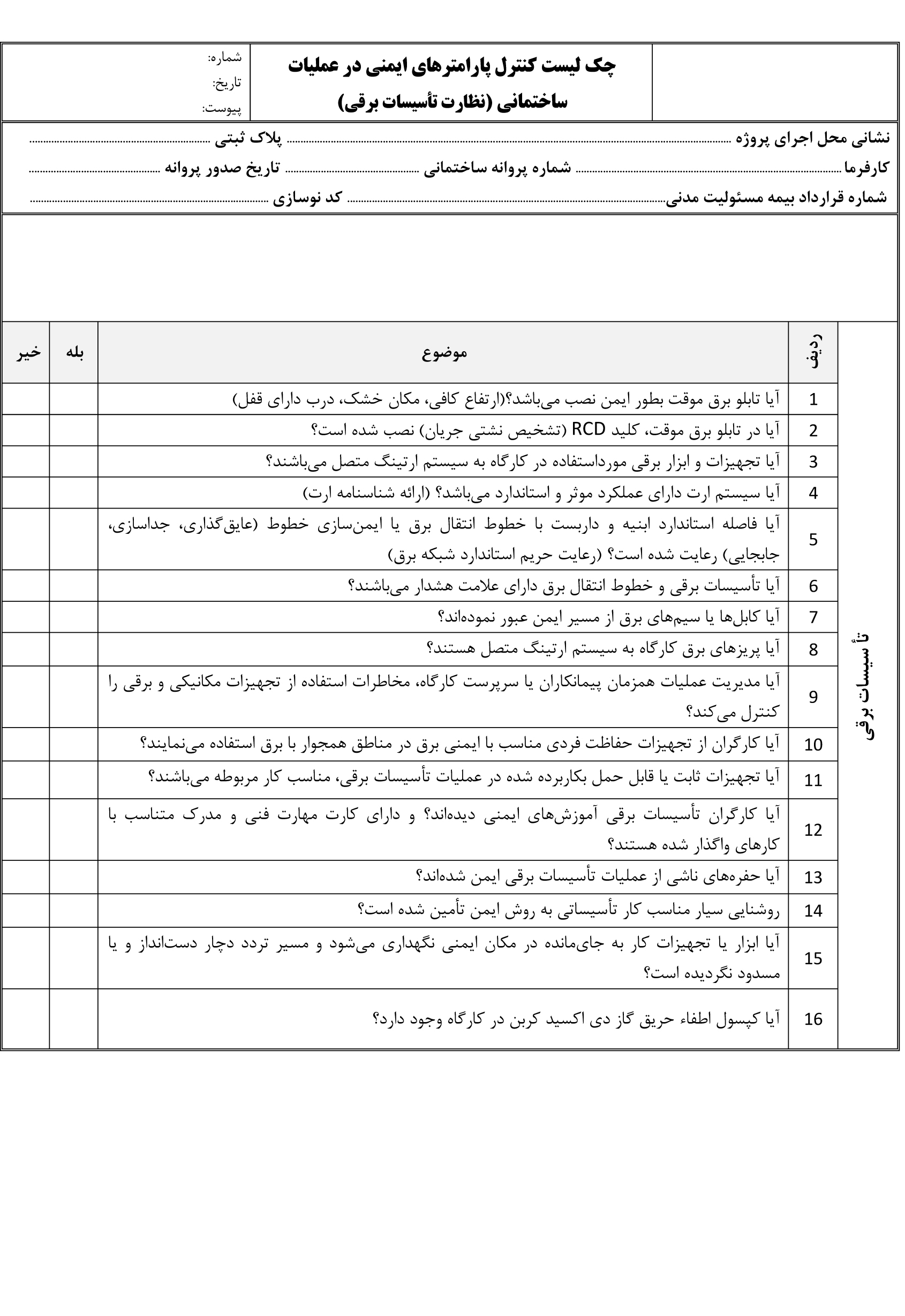 چک لیست کنترل پارامترهای ایمنی در عملیات ساختمانی ( نظارت تاسیسات برقی)